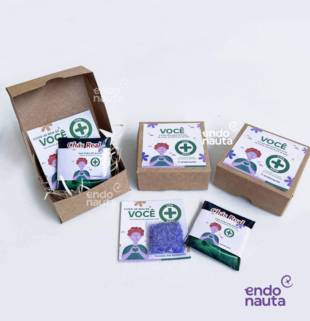 Kit Bem Me Quero: presente de aniversário do colaborador com ótimo custo-benefício. Caixa personalizada, chá e escalda-pés. Ideal para endomarketing e day off.